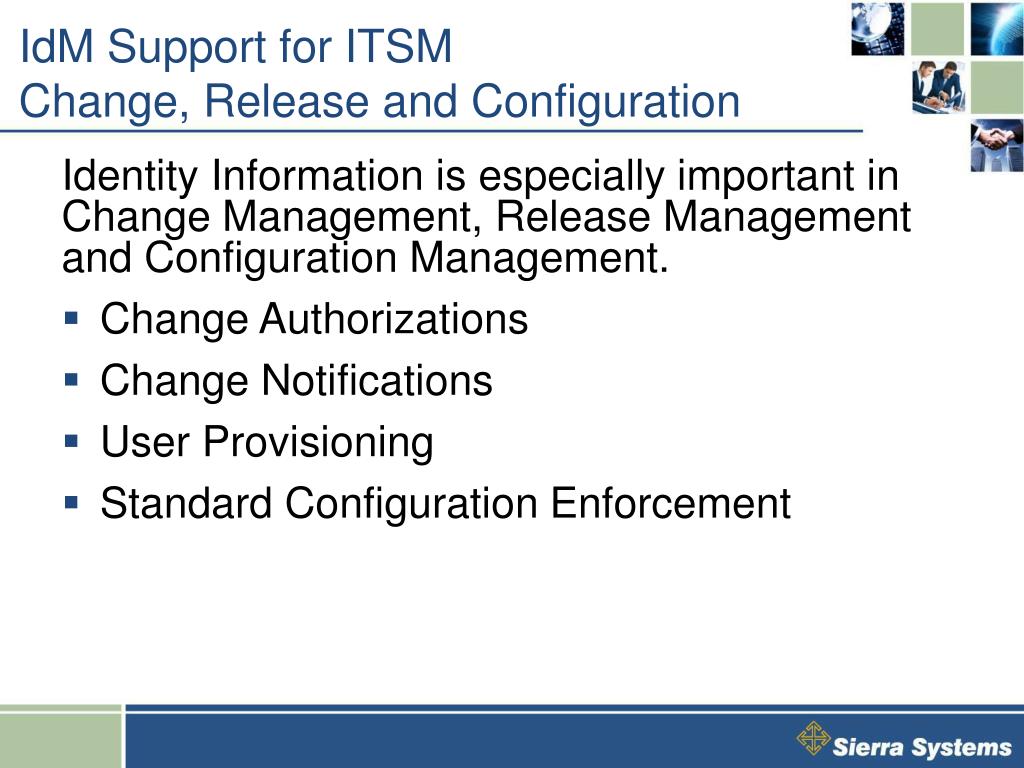 IdM Support for ITSMChange, Release and Configuration Identity Information is especially important in Change Management, Release Management and Configuration Management. Change Authorizations Change Notifications User Provisioning Standard Configuration Enforcement