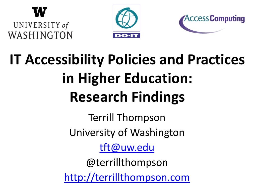 IT Accessibility Policies and Practices in Higher Education: Research Findings Terrill Thompson University of Washington tft@uw.edu @terrillthompson http://terrillthompson.com
