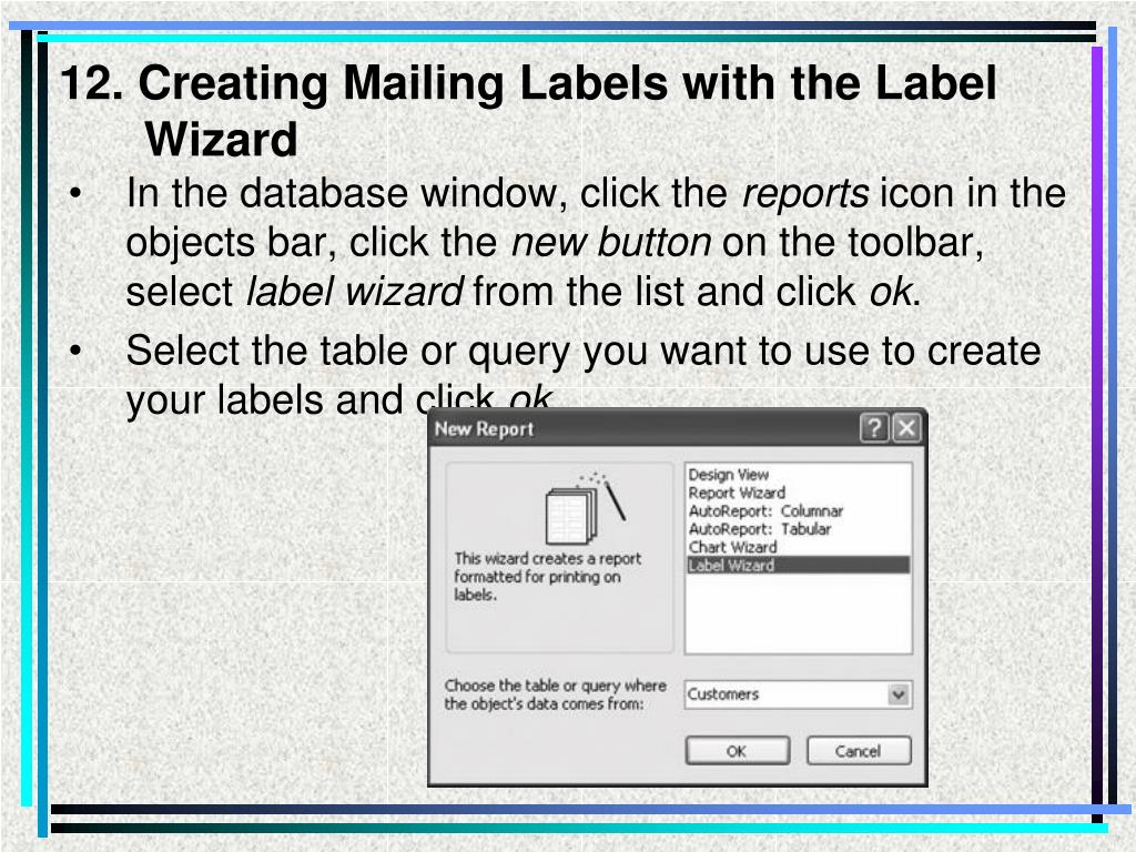 12. Creating Mailing Labels with the Label Wizard In the database window, click the reports icon in the objects bar, click the new button on the toolbar, select label wizard from the list and click ok. Select the table or query you want to use to create your labels and click ok.