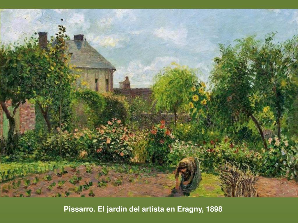 El Museo Thyssen y la Fundación Caja Madrid vuelven la mirada al impresionismo. Pero esta vez abundando en el tema de su pasión por los jardines, uno de los territorios más explorados de los impresionistas, aunque curiosamente menos estudiados en las muestras que se les han dedicado. Con este motivo se ha organizado esta exposición que reúne 130 obras de los maestros del grupo (Manet, Monet, Renoir, Pissarro, Sisley...), junto a los artistas precursores (Delacroix, Corot, Millet y Bazille, entre otros) y los postimpresionistas de primera hora (Van Gogh, Nolde, Munch, Klimt, Bonnard, pero también los españoles Sorolla y Regoyos), incluso algunos nombres esenciales de la vanguardia como Ernst o Malévich... Desde la década de 1860 los jardines fueron muy populares en Francia. La introducción y el cruce de cientos de plantas y especies de flores “nuevas” procedentes de Asia, África y América, así como la inauguración y apertura al público de los primeros parques reales, estimularon un gran “movimiento hortícola”. Cultivar y disfrutar de las flores en un jardín decorativo y de esparcimiento se había convertido en uno de los pasatiempos predilectos desde mediados del siglo XIX al que no fueron ajenos el grupo de pintores impresionistas; muchos compartieron esta afición, (Monet, Calleibotte, Guillaumin) intercambiándose consejos de jardinería y experiencias, y creando sus propios “jardines de artista”. Con su gusto por el color, el trabajo al aire libre, los efectos de la luz y los temas de la vida moderna, los impresionistas y sus seguidores tomaron de forma natural flores, parques y jardines como motivo artístico y fuente frecuente de inspiración. El jardín puede ser un espacio de recreo, un territorio donde prende la intimidad, un lugar donde crear belleza con las plantas, pero puede ser también una reivindicación de la naturaleza como elemento productivo. De ahí la atención al huerto, el lugar de cultivo, que interesó especialmente a Pissarro, “el pintor de las coles”, al que le gustaba pintar huertos y labradores trabajando, que apreciaba más que al burgués paseando por su jardín decorativo.