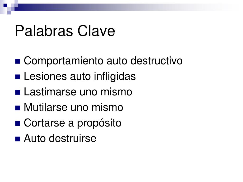 Palabras Clave • Comportamiento auto destructivo • Lesiones auto infligidas • Lastimarse uno mismo • Mutilarse uno mismo • Cortarse a propósito • Auto destruirse