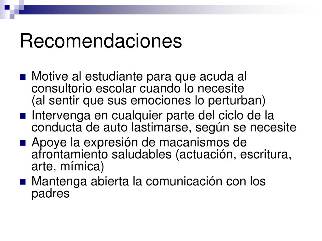 Recomendaciones • Motive al estudiante para que acuda al consultorio escolar cuando lo necesite (al sentir que sus emociones lo perturban) • Intervenga en cualquier parte del ciclo de la conducta de auto lastimarse, según se necesite • Apoye la expresión de macanismos de afrontamiento saludables (actuación, escritura, arte, mímica) • Mantenga abierta la comunicación con los padres