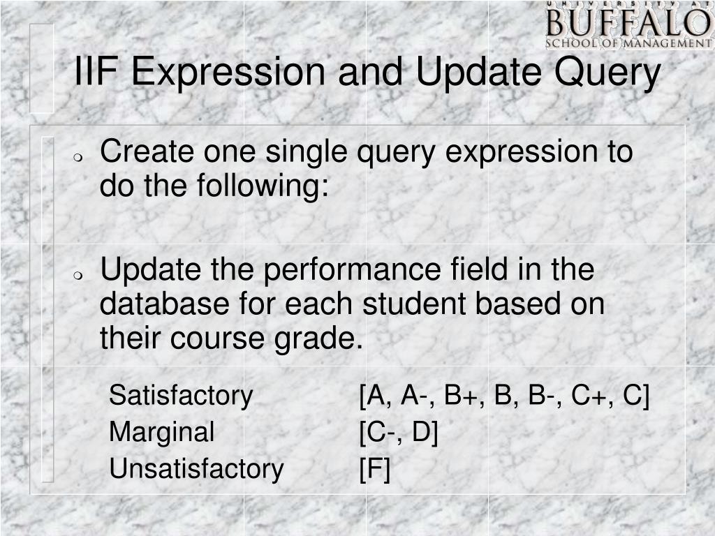 IIF Expression and Update Query • Create one single query expression to do the following: • Update the performance field in the database for each student based on their course grade. Satisfactory [A, A-, B+, B, B-, C+, C] Marginal [C-, D] Unsatisfactory [F]