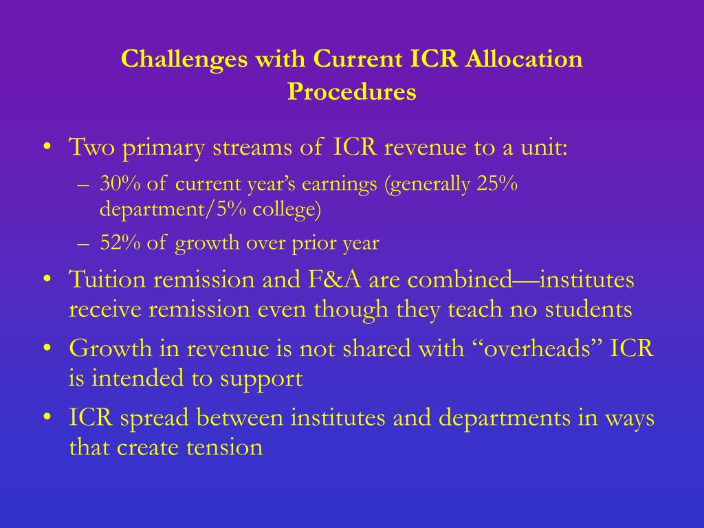 Challenges with Current ICR Allocation Procedures • Two primary streams of ICR revenue to a unit: • 30% of current year’s earnings (generally 25% department/5% college) • 52% of growth over prior year • Tuition remission and F&A are combined—institutes receive remission even though they teach no students • Growth in revenue is not shared with “overheads” ICR is intended to support • ICR spread between institutes and departments in ways that create tension