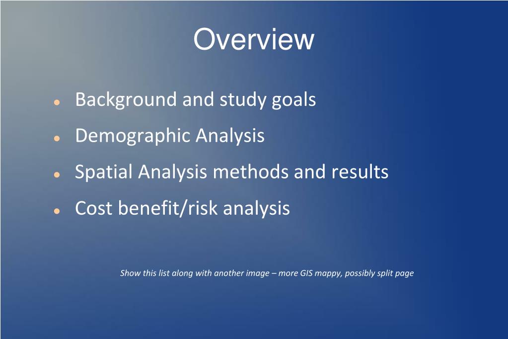 Overview • Background and study goals • Demographic Analysis • Spatial Analysis methods and results • Cost benefit/risk analysis Show this list along with another image – more GIS mappy, possibly split page
