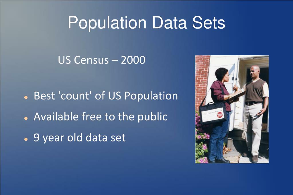 Population Data Sets • US Census – 2000 • Best 'count' of US Population • Available free to the public • 9 year old data set