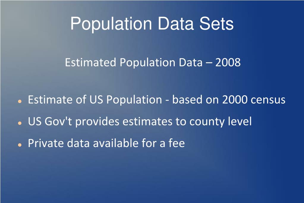 Population Data Sets • Estimated Population Data – 2008 • Estimate of US Population - based on 2000 census • US Gov't provides estimates to county level • Private data available for a fee