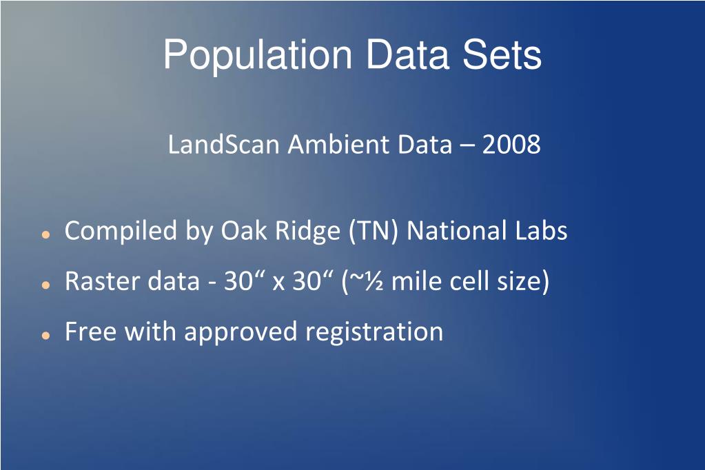 Population Data Sets • LandScan Ambient Data – 2008 • Compiled by Oak Ridge (TN) National Labs • Raster data - 30“ x 30“ (~½ mile cell size) • Free with approved registration