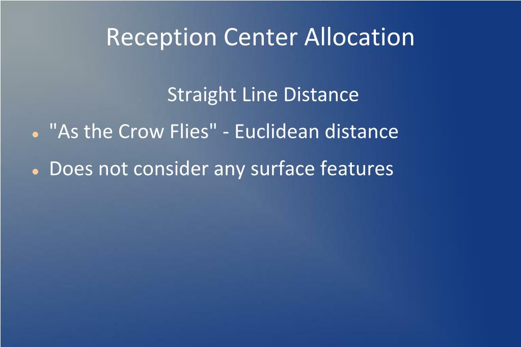 Reception Center Allocation • Straight Line Distance • "As the Crow Flies" - Euclidean distance • Does not consider any surface features