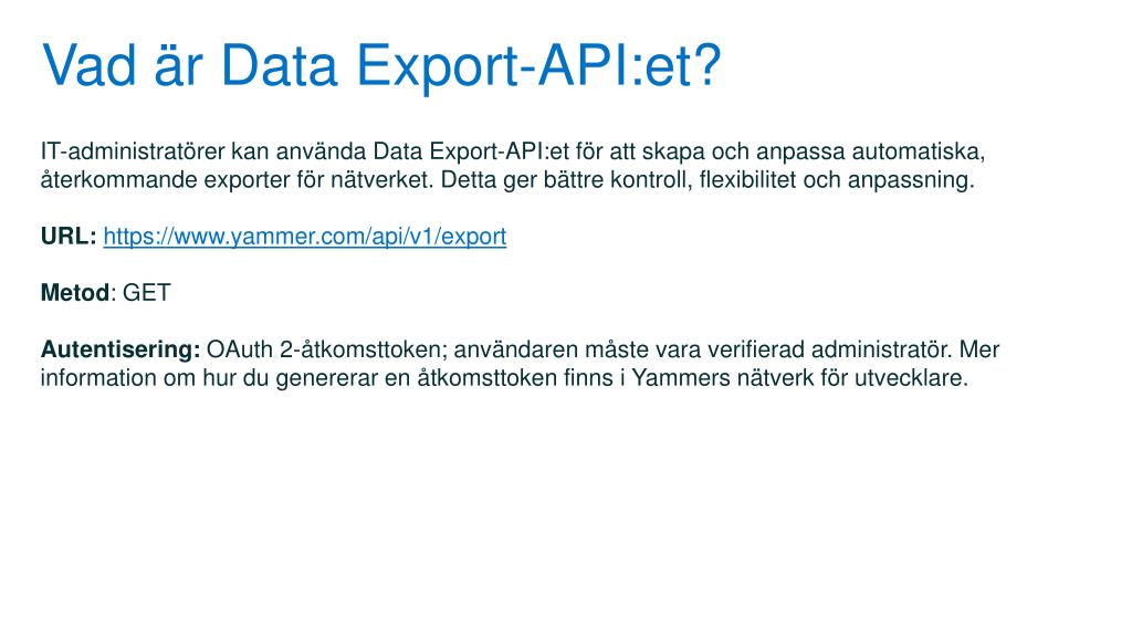 Vad är Data Export-API:et? • IT-administratörerkananvända Data Export-API:etförattskapaochanpassaautomatiska, återkommande exporter förnätverket. Dettagerbättrekontroll, flexibilitetochanpassning. • URL: https://www.yammer.com/api/v1/export • Metod: GET • Autentisering: OAuth 2-åtkomsttoken; användarenmåstevaraverifieradadministratör. Mer information om hur du genererar en åtkomsttokenfinnsi Yammers nätverkförutvecklare.