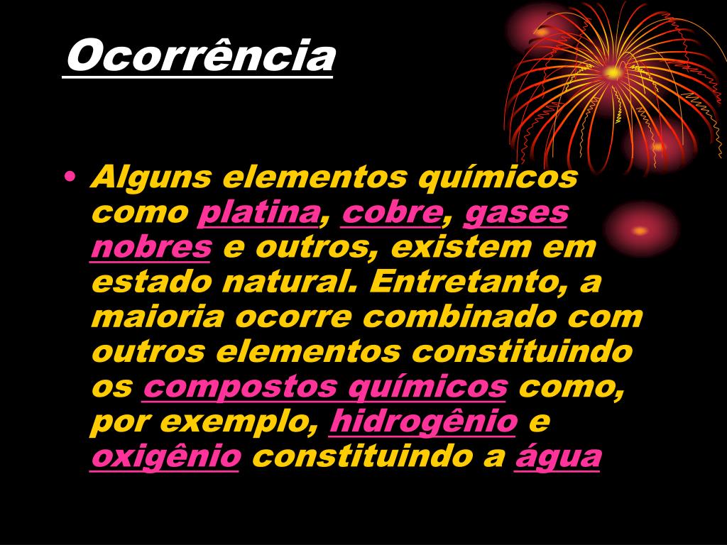 Ocorrência • Alguns elementos químicos como platina, cobre, gases nobres e outros, existem em estado natural. Entretanto, a maioria ocorre combinado com outros elementos constituindo os compostos químicos como, por exemplo, hidrogênio e oxigênio constituindo a água