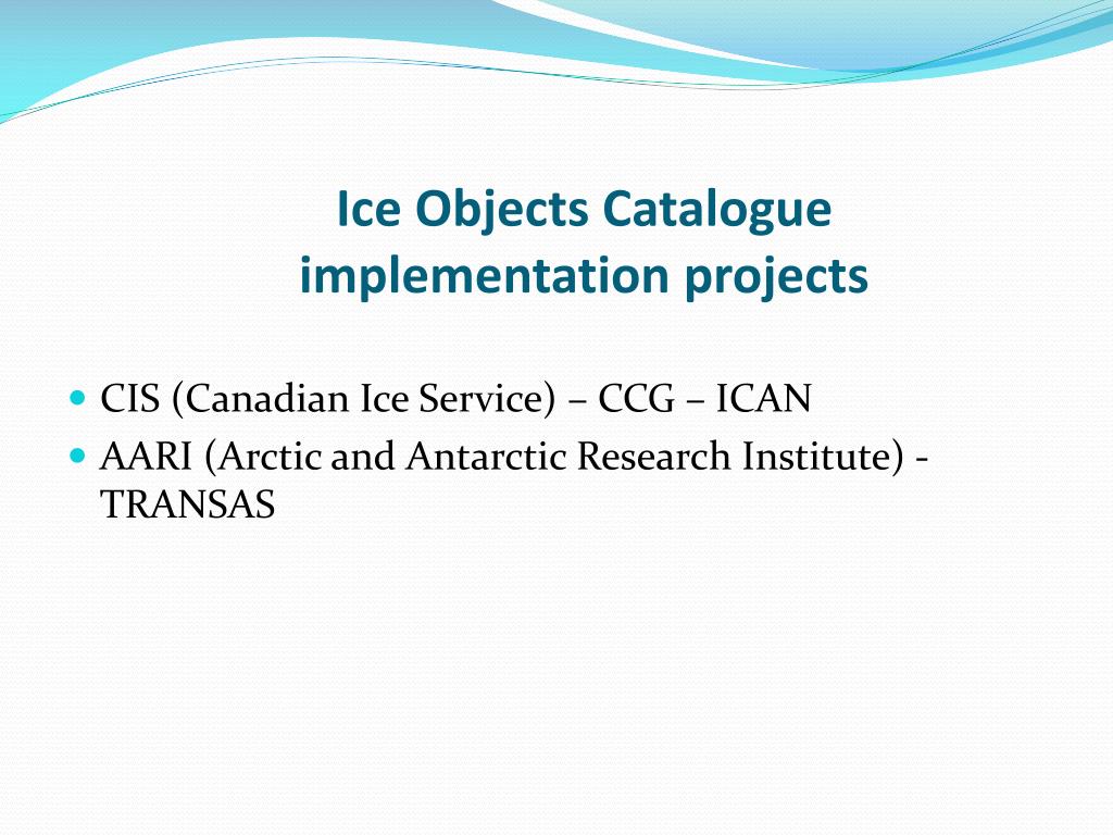 Ice Objects Catalogue implementation projects • CIS (Canadian Ice Service) – CCG – ICAN • AARI (Arctic and Antarctic Research Institute) - TRANSAS