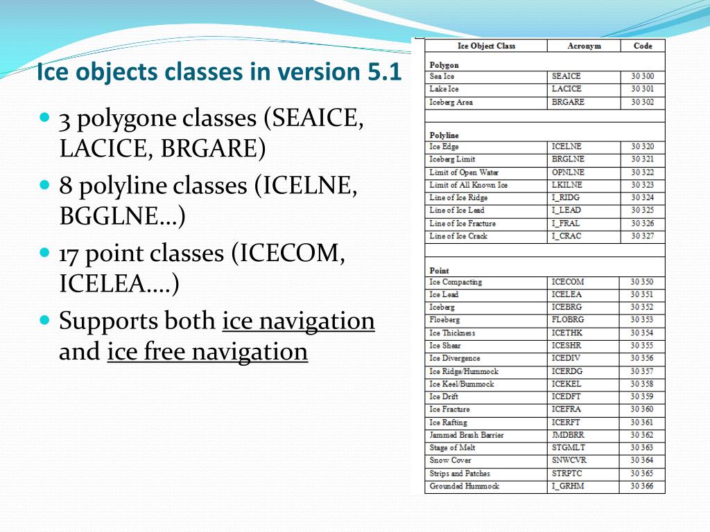 Ice objects classes in version 5.1 • 3 polygone classes (SEAICE, LACICE, BRGARE) • 8 polyline classes (ICELNE, BGGLNE…) • 17 point classes (ICECOM, ICELEA….) • Supports both ice navigation and ice free navigation