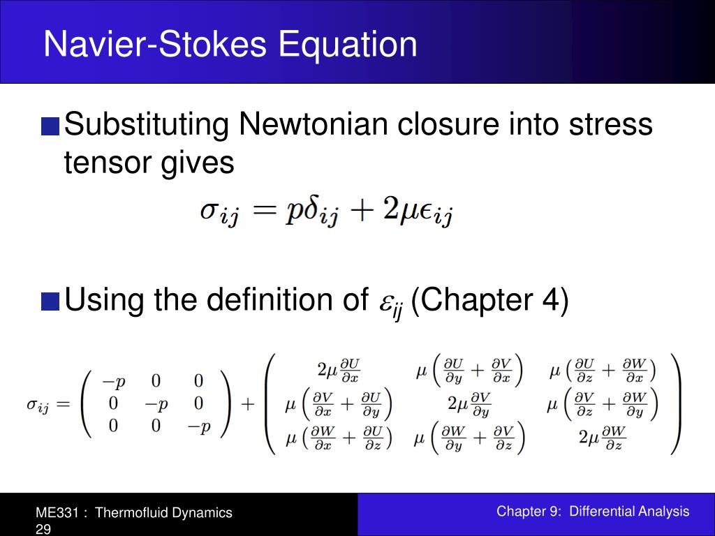 Navier-Stokes Equation • Substituting Newtonian closure into stress tensor gives • Using the definition of ij(Chapter 4)