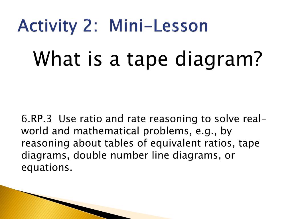 Activity 2: Mini-Lesson What is a tape diagram? 6.RP.3 Use ratio and rate reasoning to solve real-world and mathematical problems, e.g., by reasoning about tables of equivalent ratios, tape diagrams, double number line diagrams, or equations.