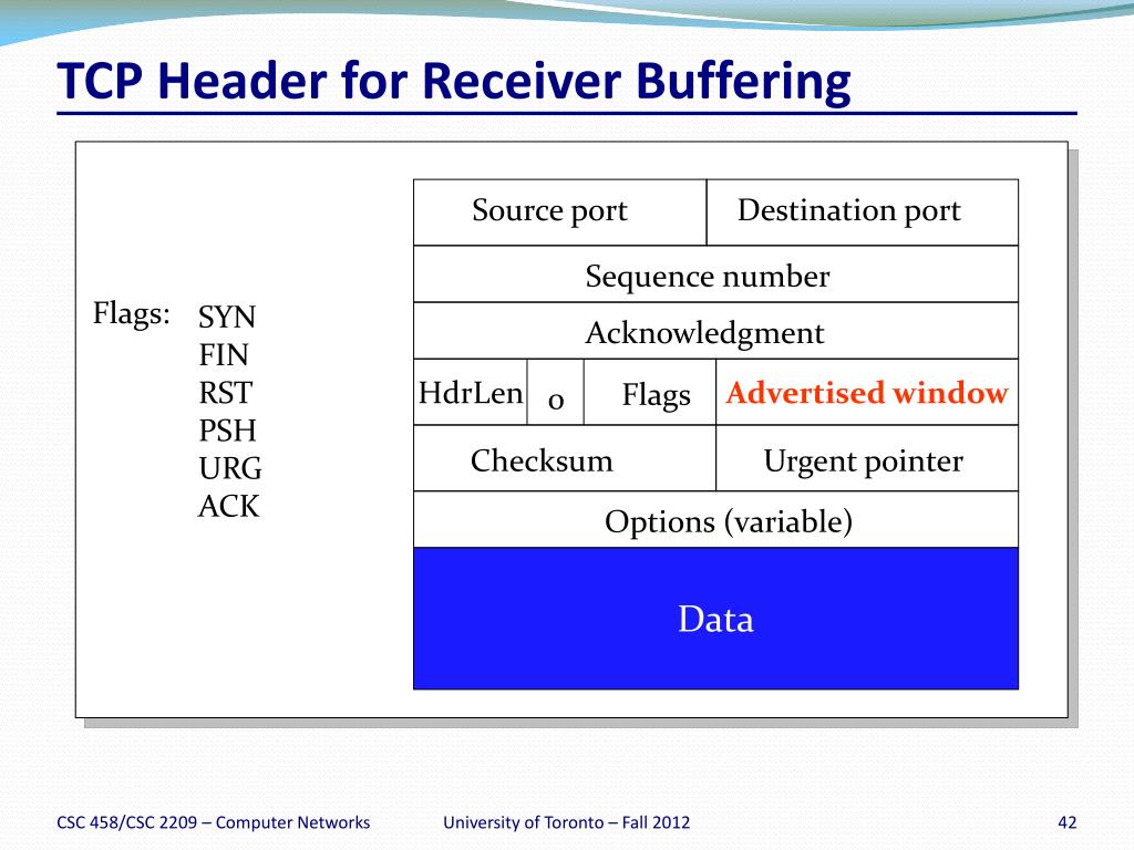TCP Header for Receiver Buffering Source port Destination port Sequence number Flags: SYN FIN RST PSH URG ACK Acknowledgment HdrLen Advertised window Flags 0 Checksum Urgent pointer Options (variable) Data University of Toronto – Fall 2012