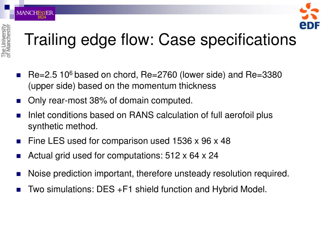 Trailing edge flow: Case specifications • Re=2.5 106 based on chord, Re=2760 (lower side) and Re=3380 (upper side) based on the momentum thickness • Only rear-most 38% of domain computed. • Inlet conditions based on RANS calculation of full aerofoil plus synthetic method. • Fine LES used for comparison used 1536 x 96 x 48 • Actual grid used for computations: 512 x 64 x 24 • Noise prediction important, therefore unsteady resolution required. • Two simulations: DES +F1 shield function and Hybrid Model.