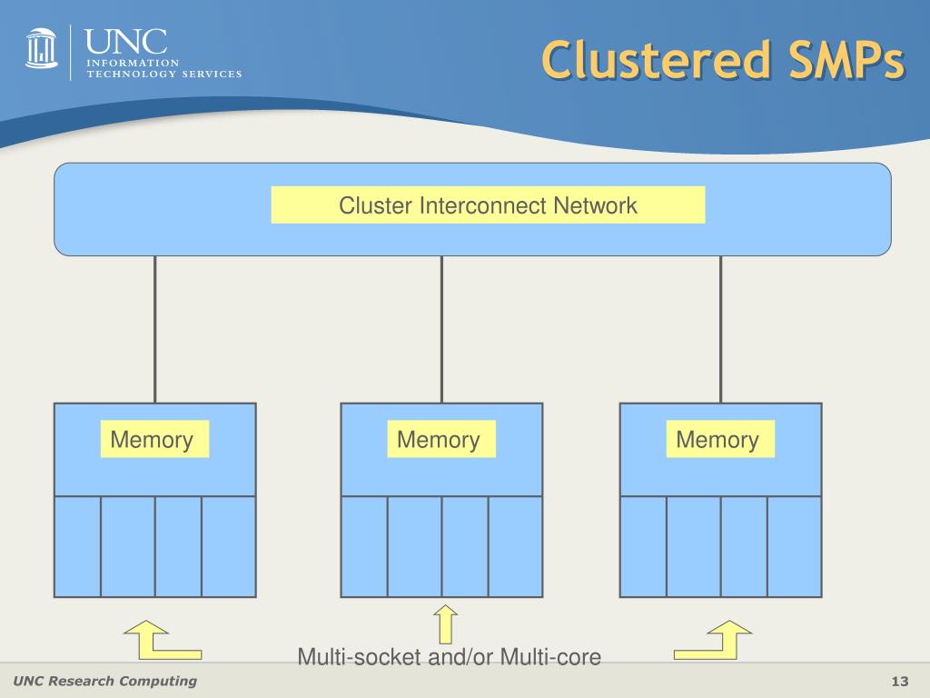 Clustered SMPs Cluster Interconnect Network Memory Memory Memory Multi-socket and/or Multi-core