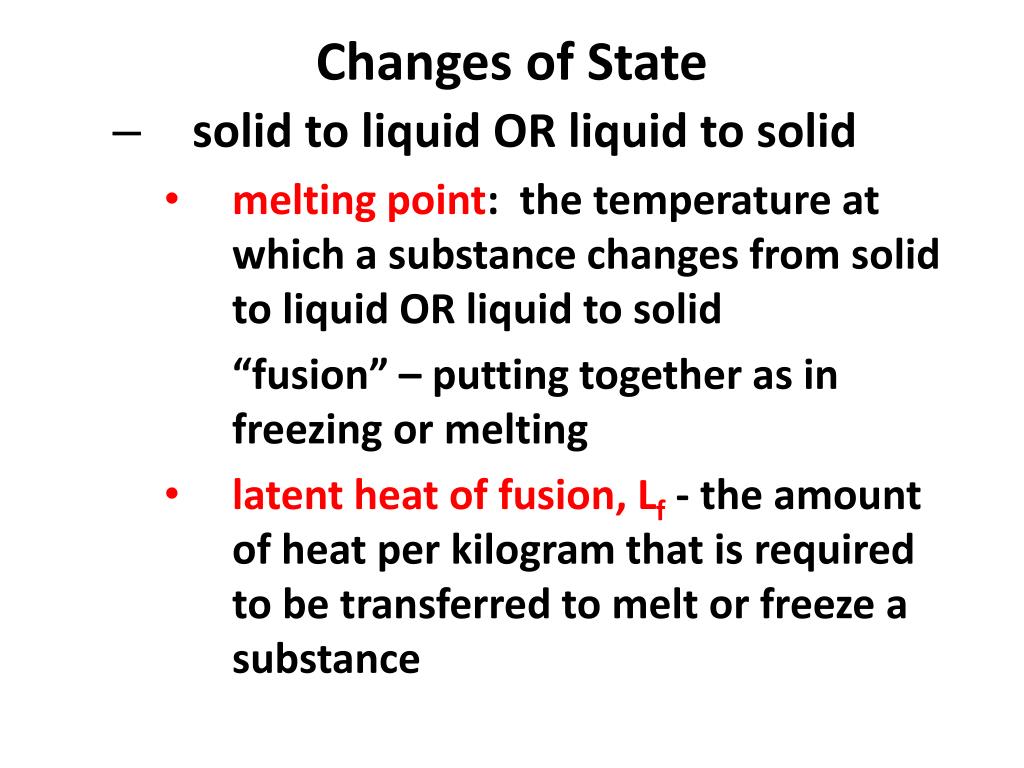 Changes of State • solid to liquid OR liquid to solid • melting point: the temperature at which a substance changes from solid to liquid OR liquid to solid “fusion” – putting together as in freezing or melting • latent heat of fusion, Lf - the amount of heat per kilogram that is required to be transferred to melt or freeze a substance