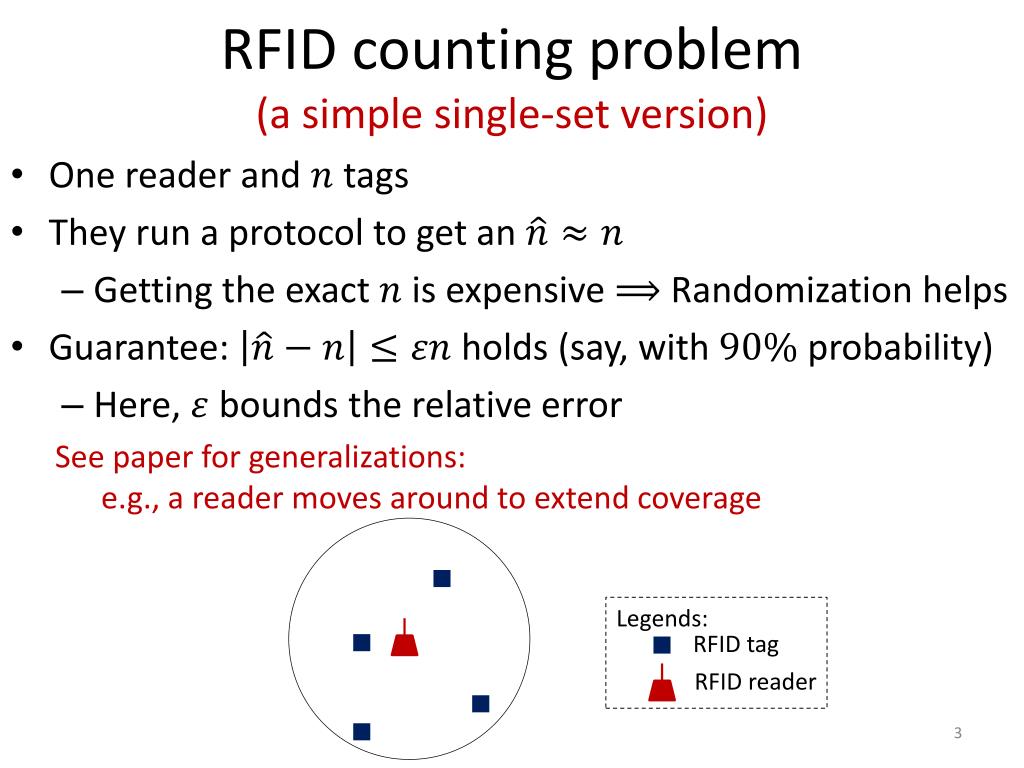 RFID counting problem (a simple single-set version) • One reader and tags • They run a protocol to get an • Getting the exact is expensive Randomization helps • Guarantee: holds (say, with probability) • Here, bounds the relative error See paper for generalizations: e.g., a reader moves around to extend coverage Legends: RFID tag RFID reader