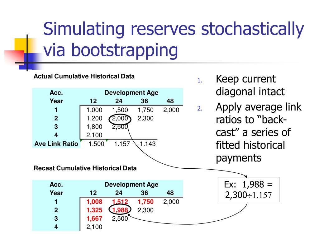Keep current diagonal intact Apply average link ratios to “back-cast” a series of fitted historical payments Simulating reserves stochastically via bootstrapping Ex: 1,988 = 2,300¸1.157