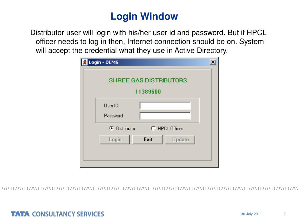 Login Window Distributor user will login with his/her user id and password. But if HPCL officer needs to log in then, Internet connection should be on. System will accept the credential what they use in Active Directory. 7