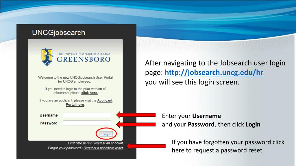 After navigating to the Jobsearch user login page: http://jobsearch.uncg.edu/hryou will see this login screen. Enter your Username and your Password, then click Login If you have forgotten your password click here to request a password reset.