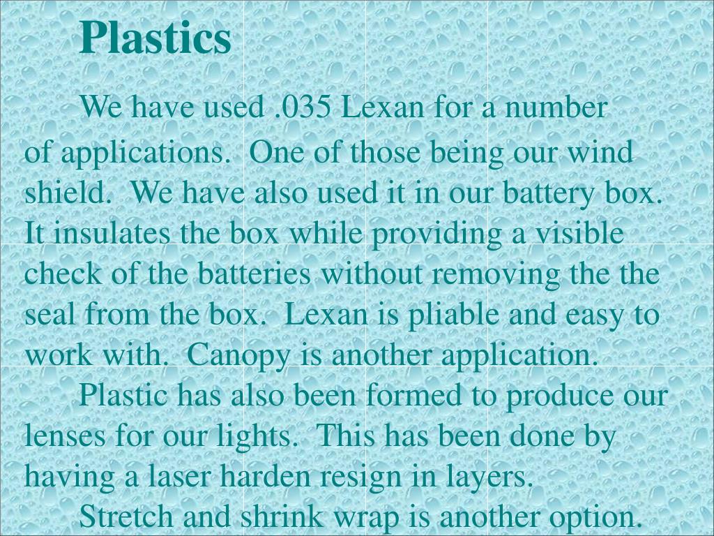 Plastics We have used .035 Lexan for a number of applications. One of those being our wind shield. We have also used it in our battery box. It insulates the box while providing a visible check of the batteries without removing the the seal from the box. Lexan is pliable and easy to work with. Canopy is another application. Plastic has also been formed to produce our lenses for our lights. This has been done by having a laser harden resign in layers. Stretch and shrink wrap is another option.