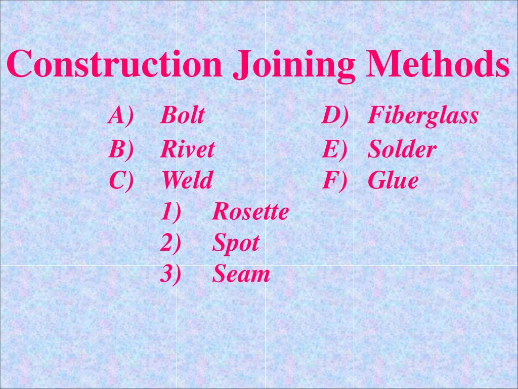 Construction Joining Methods A) Bolt D) Fiberglass B) Rivet E) Solder C) Weld F) Glue 1) Rosette 2) Spot 3) Seam