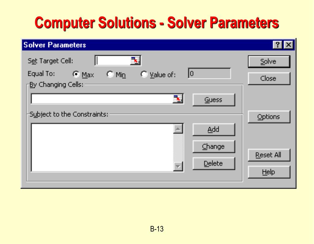 Computer Solutions • Set Target Cell: to value of objective function. • E3 • Equal To:Max or Min • By Changing Cells: = Sol’n values (decision variable values). • B7:D7 • Subject to the Constraints: • Click Add to add each constraint: • LHS =, , RHS
