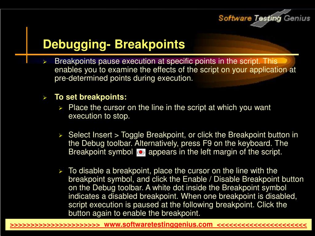 Debugging- Breakpoints Breakpoints pause execution at specific points in the script. This enables you to examine the effects of the script on your application at pre-determined points during execution. To set breakpoints: Place the cursor on the line in the script at which you want execution to stop. Select Insert > Toggle Breakpoint, or click the Breakpoint button in the Debug toolbar. Alternatively, press F9 on the keyboard. The Breakpoint symbol appears in the left margin of the script. To disable a breakpoint, place the cursor on the line with the breakpoint symbol, and click the Enable / Disable Breakpoint button on the Debug toolbar. A white dot inside the Breakpoint symbol indicates a disabled breakpoint. When one breakpoint is disabled, script execution is paused at the following breakpoint. Click the button again to enable the breakpoint. >>>>>>>>>>>>>>>>>>>>>> www.softwaretestinggenius.com <<<<<<<<<<<<<<<<<<<<<<