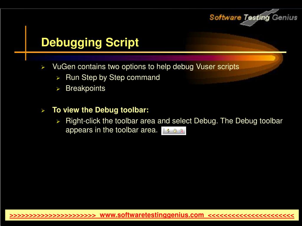 Debugging Script VuGen contains two options to help debug Vuser scripts Run Step by Step command Breakpoints To view the Debug toolbar: Right-click the toolbar area and select Debug. The Debug toolbar appears in the toolbar area. >>>>>>>>>>>>>>>>>>>>>> www.softwaretestinggenius.com <<<<<<<<<<<<<<<<<<<<<<