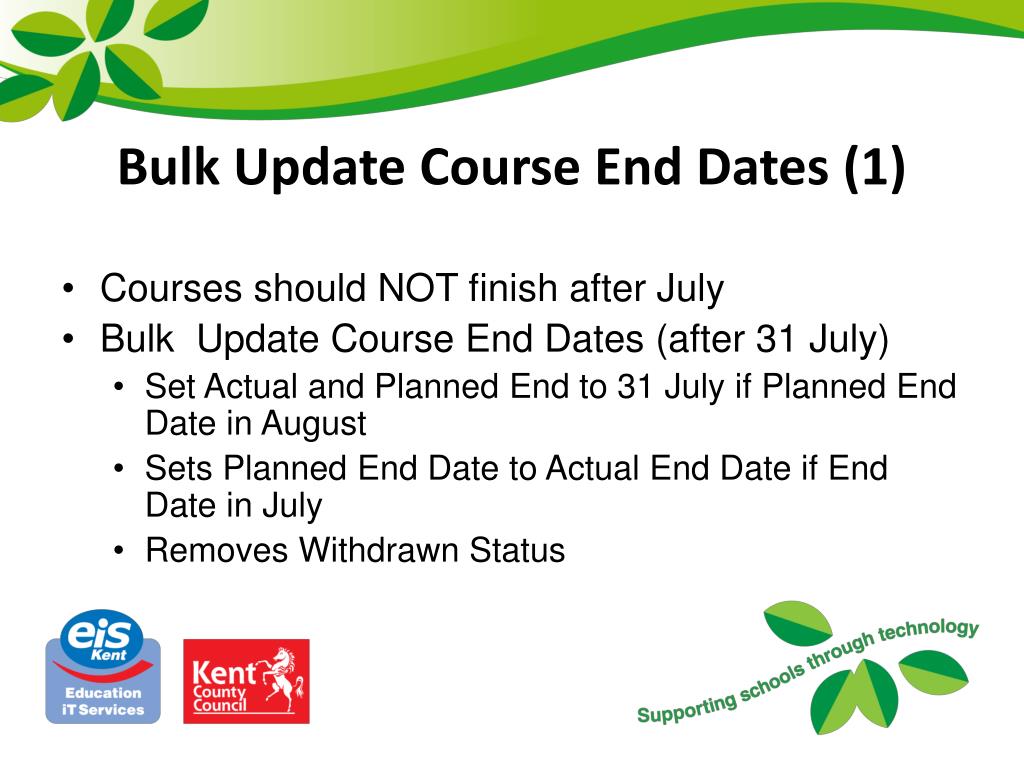 Bulk Update Course End Dates (1) • Courses should NOT finish after July • Bulk Update Course End Dates (after 31 July) • Set Actual and Planned End to 31 July if Planned End Date in August • Sets Planned End Date to Actual End Date if End Date in July • Removes Withdrawn Status