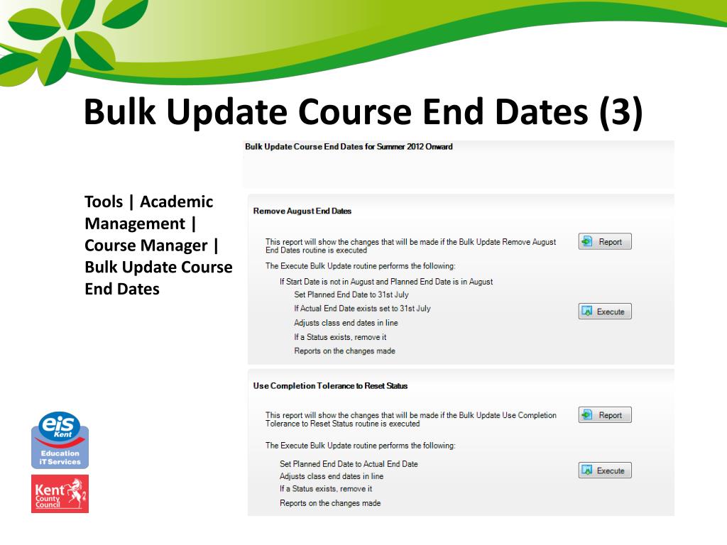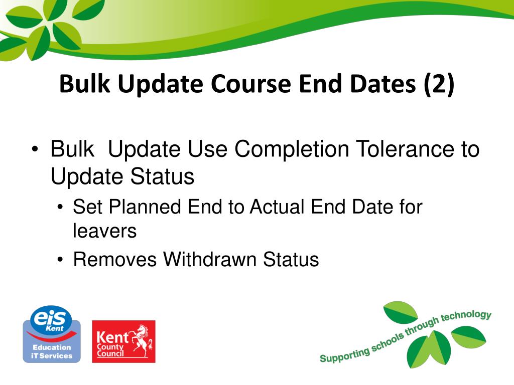 Bulk Update Course End Dates (2) • Bulk Update Use Completion Tolerance to Update Status • Set Planned End to Actual End Date for leavers • Removes Withdrawn Status