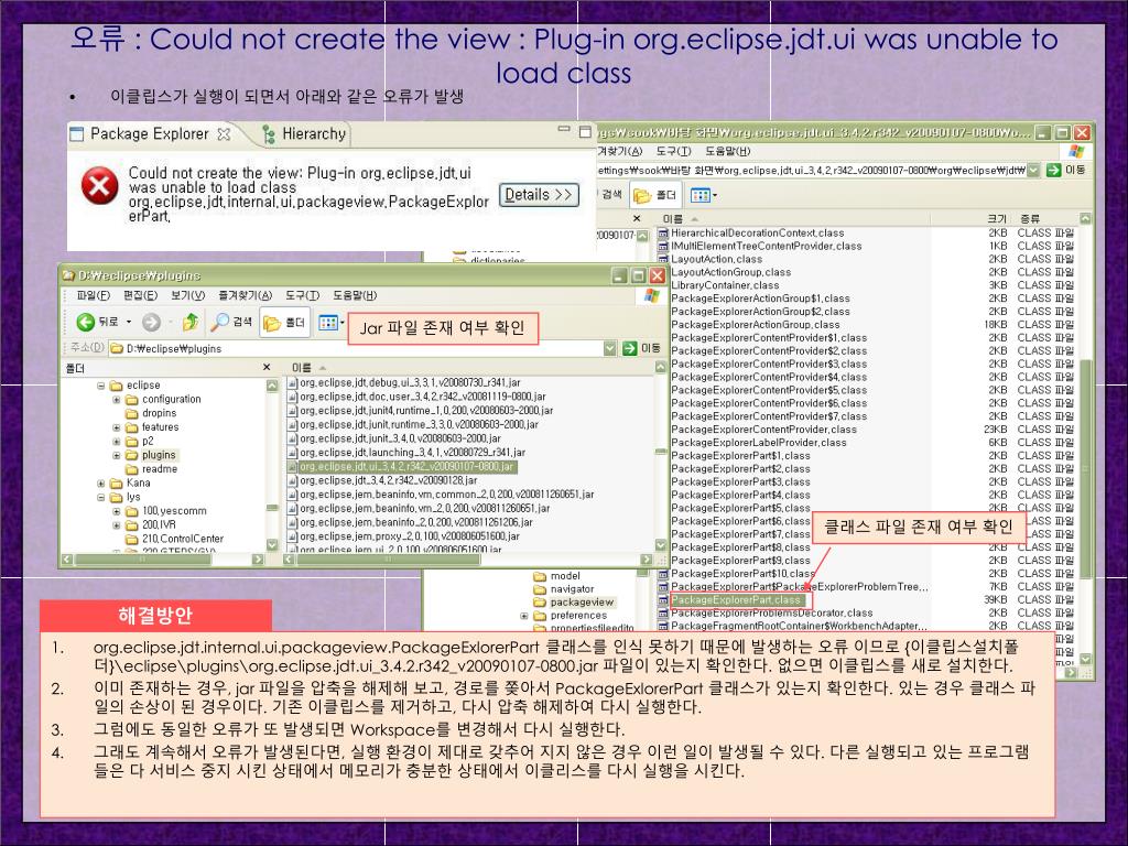 해결방안 • org.eclipse.jdt.internal.ui.packageview.PackageExlorerPart 클래스를 인식 못하기 때문에 발생하는 오류 이므로 {이클립스설치폴더}\eclipse\plugins\org.eclipse.jdt.ui_3.4.2.r342_v20090107-0800.jar 파일이 있는지 확인한다. 없으면 이클립스를 새로 설치한다. • 이미 존재하는 경우, jar 파일을 압축을 해제해 보고, 경로를 쫒아서 PackageExlorerPart 클래스가 있는지 확인한다. 있는 경우 클래스 파일의 손상이 된 경우이다. 기존 이클립스를 제거하고, 다시 압축 해제하여 다시 실행한다. • 그럼에도 동일한 오류가 또 발생되면 Workspace를 변경해서 다시 실행한다. • 그래도 계속해서 오류가 발생된다면, 실행 환경이 제대로 갖추어 지지 않은 경우 이런 일이 발생될 수 있다. 다른 실행되고 있는 프로그램들은 다 서비스 중지 시킨 상태에서 메모리가 충분한 상태에서 이클리스를 다시 실행을 시킨다. 오류 : Could not create the view : Plug-in org.eclipse.jdt.ui was unable to load class • 이클립스가 실행이 되면서 아래와 같은 오류가 발생 Jar 파일 존재 여부 확인 클래스 파일 존재 여부 확인