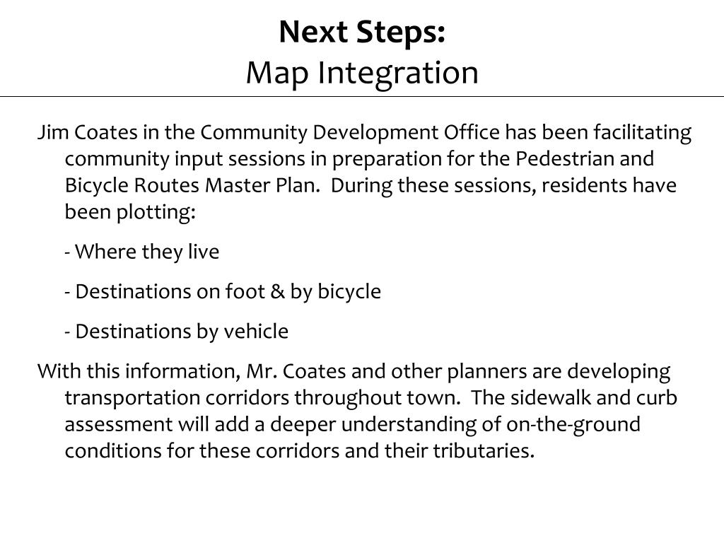 Next Steps:Map Integration Jim Coates in the Community Development Office has been facilitating community input sessions in preparation for the Pedestrian and Bicycle Routes Master Plan. During these sessions, residents have been plotting: - Where they live - Destinations on foot & by bicycle - Destinations by vehicle With this information, Mr. Coates and other planners are developing transportation corridors throughout town. The sidewalk and curb assessment will add a deeper understanding of on-the-ground conditions for these corridors and their tributaries.