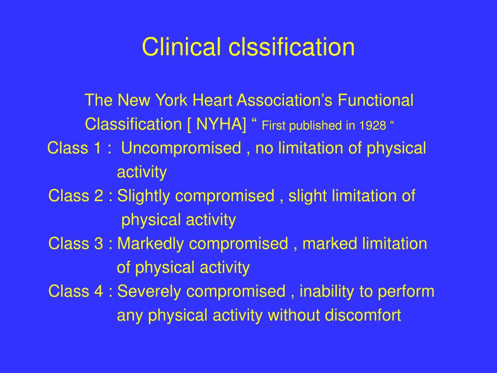 Clinical clssification The New York Heart Association’s Functional Classification [ NYHA] “ First published in 1928 “ Class 1 : Uncompromised , no limitation of physical activity Class 2 : Slightly compromised , slight limitation of physical activity Class 3 : Markedly compromised , marked limitation of physical activity Class 4 : Severely compromised , inability to perform any physical activity without discomfort
