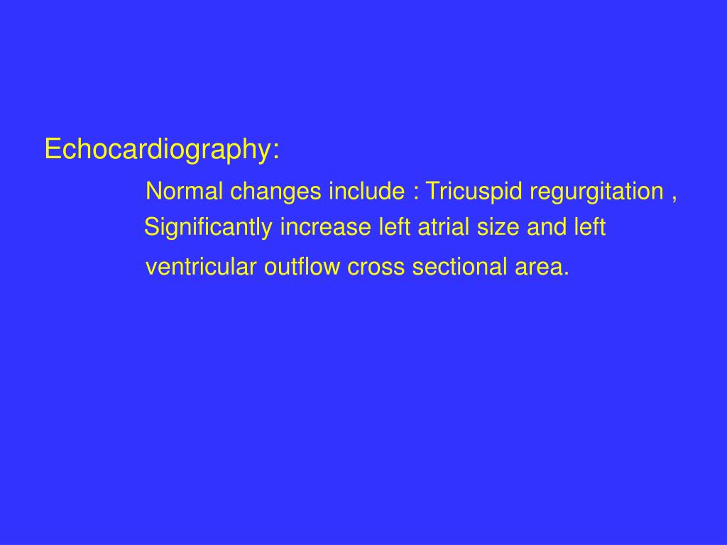 Echocardiography: Normal changes include : Tricuspid regurgitation , Significantly increase left atrial size and left ventricular outflow cross sectional area.