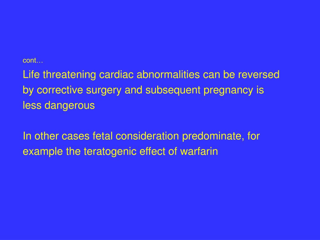 cont… Life threatening cardiac abnormalities can be reversed by corrective surgery and subsequent pregnancy is less dangerous In other cases fetal consideration predominate, for example the teratogenic effect of warfarin