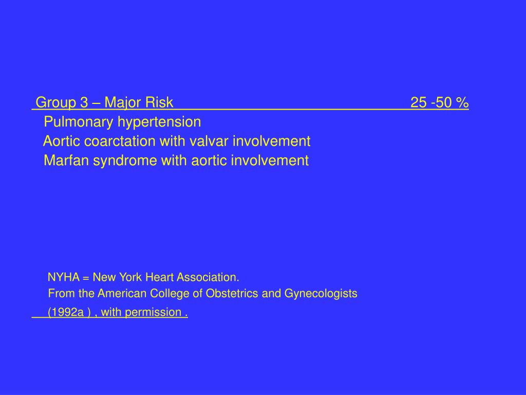 Group 3 – Major Risk 25 -50 % Pulmonary hypertension Aortic coarctation with valvar involvement Marfan syndrome with aortic involvement NYHA = New York Heart Association. From the American College of Obstetrics and Gynecologists (1992a ) , with permission .