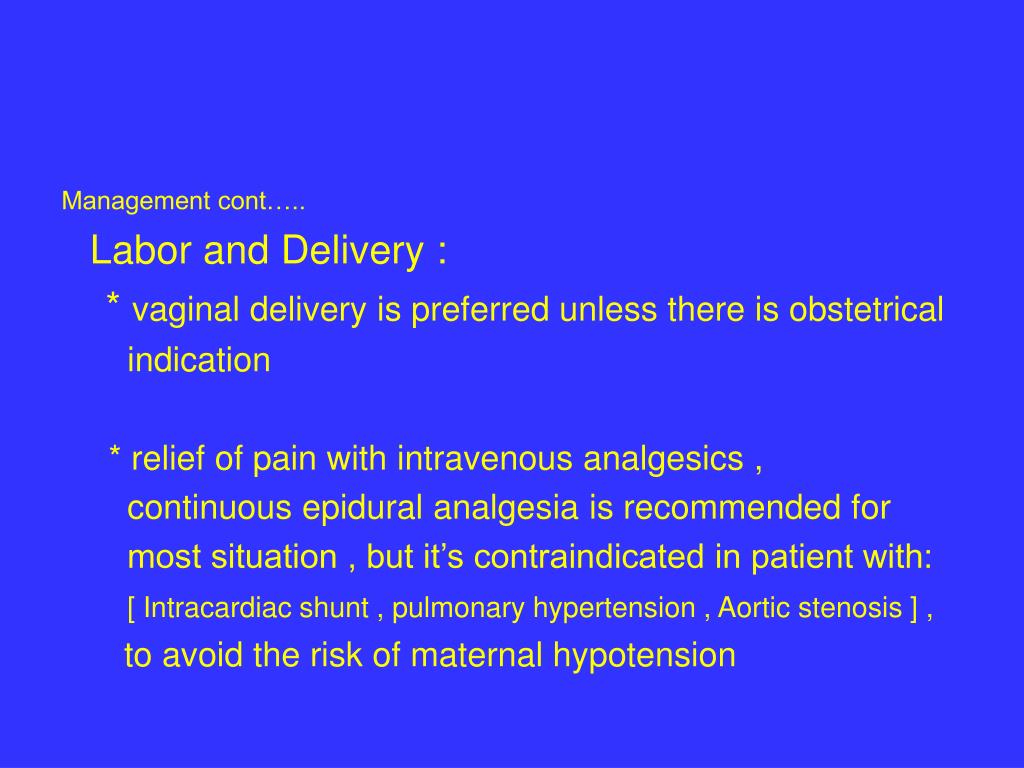 Management cont….. Labor and Delivery : * vaginal delivery is preferred unless there is obstetrical indication * relief of pain with intravenous analgesics , continuous epidural analgesia is recommended for most situation , but it’s contraindicated in patient with: [ Intracardiac shunt , pulmonary hypertension , Aortic stenosis ] , to avoid the risk of maternal hypotension