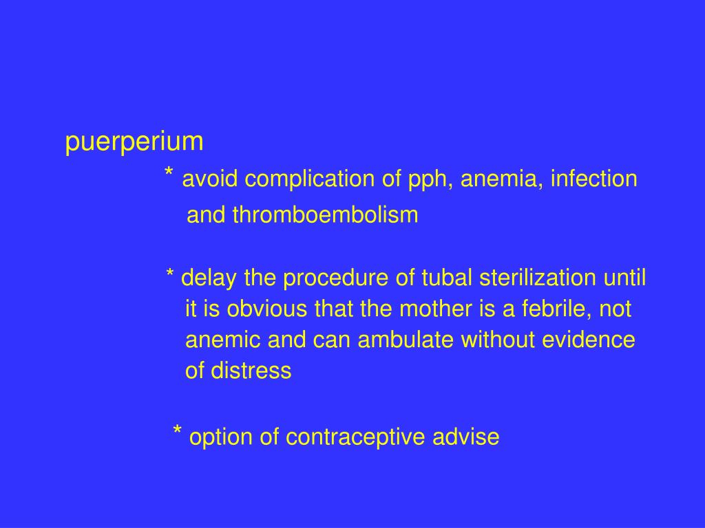 puerperium * avoid complication of pph, anemia, infection and thromboembolism * delay the procedure of tubal sterilization until it is obvious that the mother is a febrile, not anemic and can ambulate without evidence of distress * option of contraceptive advise