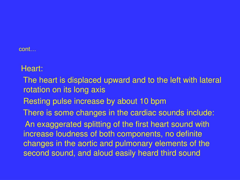 cont… Heart: The heart is displaced upward and to the left with lateral rotation on its long axis Resting pulse increase by about 10 bpm There is some changes in the cardiac sounds include: An exaggerated splitting of the first heart sound with increase loudness of both components, no definite changes in the aortic and pulmonary elements of the second sound, and aloud easily heard third sound