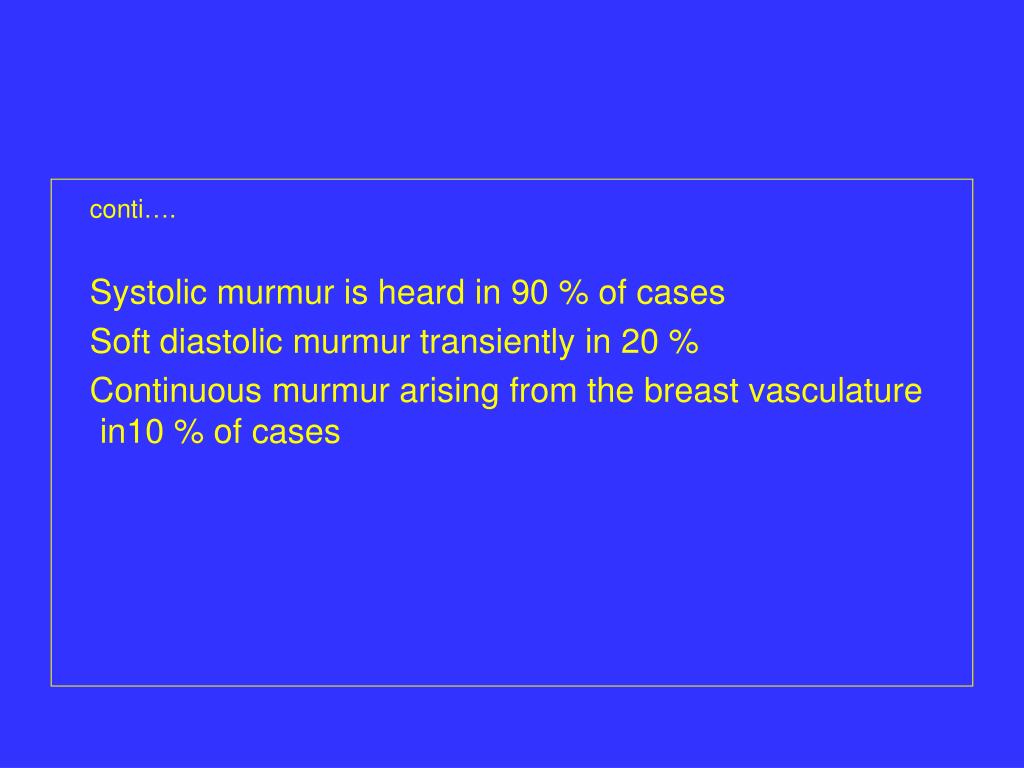 conti…. Systolic murmur is heard in 90 % of cases Soft diastolic murmur transiently in 20 % Continuous murmur arising from the breast vasculature in10 % of cases