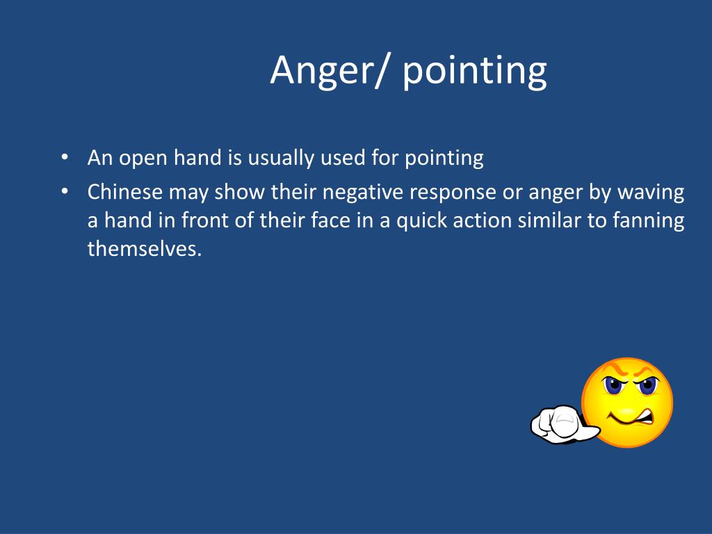 Anger/ pointing • An open hand is usually used for pointing • Chinese may show their negative response or anger by waving a hand in front of their face in a quick action similar to fanning themselves.