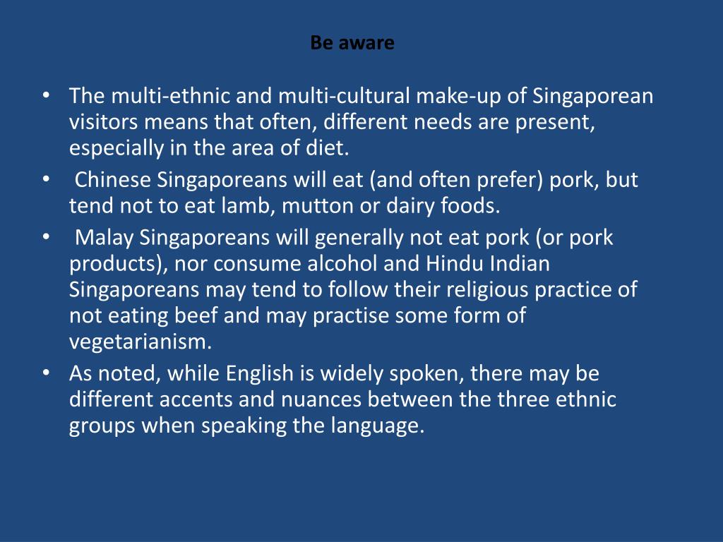 Be aware The multi-ethnic and multi-cultural make-up of Singaporean visitors means that often, different needs are present, especially in the area of diet. Chinese Singaporeans will eat (and often prefer) pork, but tend not to eat lamb, mutton or dairy foods. Malay Singaporeans will generally not eat pork (or pork products), nor consume alcohol and Hindu Indian Singaporeans may tend to follow their religious practice of not eating beef and may practise some form of vegetarianism. As noted, while English is widely spoken, there may be different accents and nuances between the three ethnic groups when speaking the language.