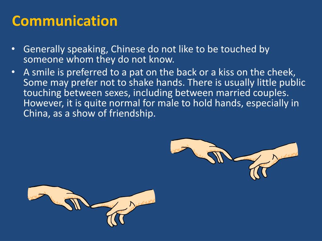 Communication • Generally speaking, Chinese do not like to be touched by someone whom they do not know. • A smile is preferred to a pat on the back or a kiss on the cheek, Some may prefer not to shake hands. There is usually little public touching between sexes, including between married couples. However, it is quite normal for male to hold hands, especially in China, as a show of friendship.
