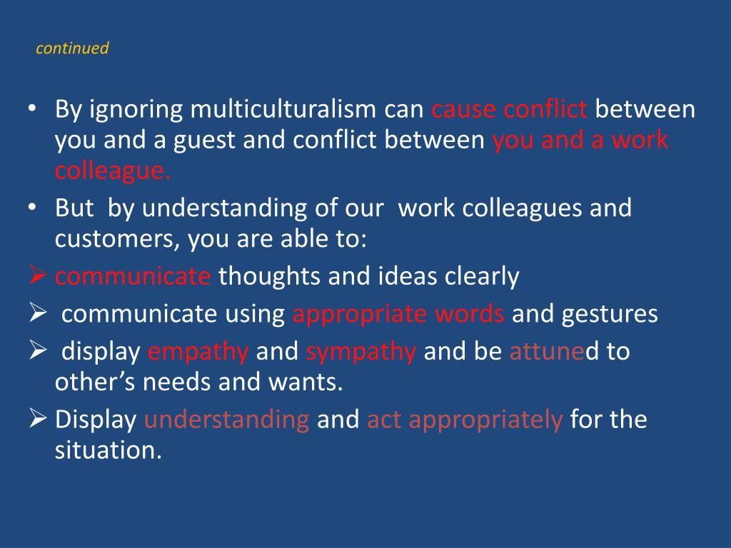 continued • By ignoring multiculturalism can cause conflict between you and a guest and conflict between you and a work colleague. • But by understanding of our work colleagues and customers, you are able to: • communicate thoughts and ideas clearly • communicate using appropriate words and gestures • display empathyand sympathy and be attuned to other’s needs and wants. • Display understanding and act appropriately for the situation.