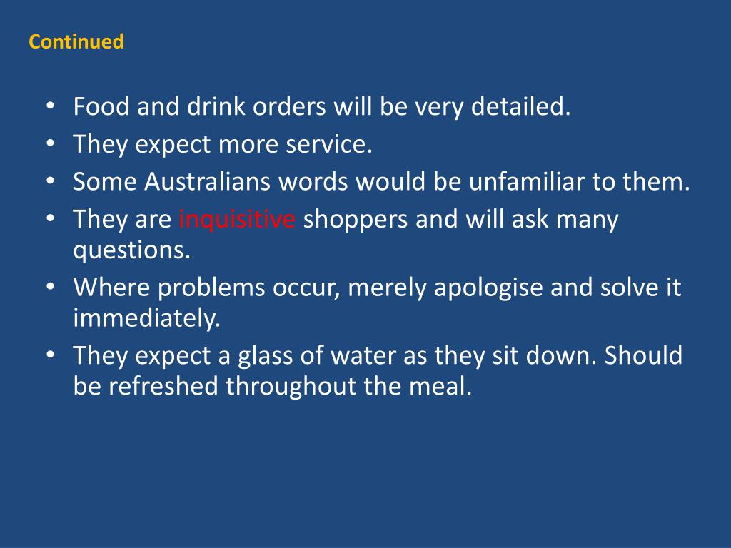 Continued Food and drink orders will be very detailed. They expect more service. Some Australians words would be unfamiliar to them. They are inquisitive shoppers and will ask many questions. Where problems occur, merely apologise and solve it immediately. They expect a glass of water as they sit down. Should be refreshed throughout the meal.