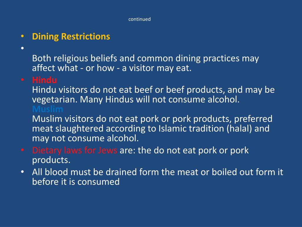 continued Dining Restrictions Both religious beliefs and common dining practices may affect what - or how - a visitor may eat. HinduHindu visitors do not eat beef or beef products, and may be vegetarian. Many Hindus will not consume alcohol.MuslimMuslim visitors do not eat pork or pork products, preferred meat slaughtered according to Islamic tradition (halal) and may not consume alcohol. Dietary laws for Jews are: the do not eat pork or pork products. All blood must be drained form the meat or boiled out form it before it is consumed